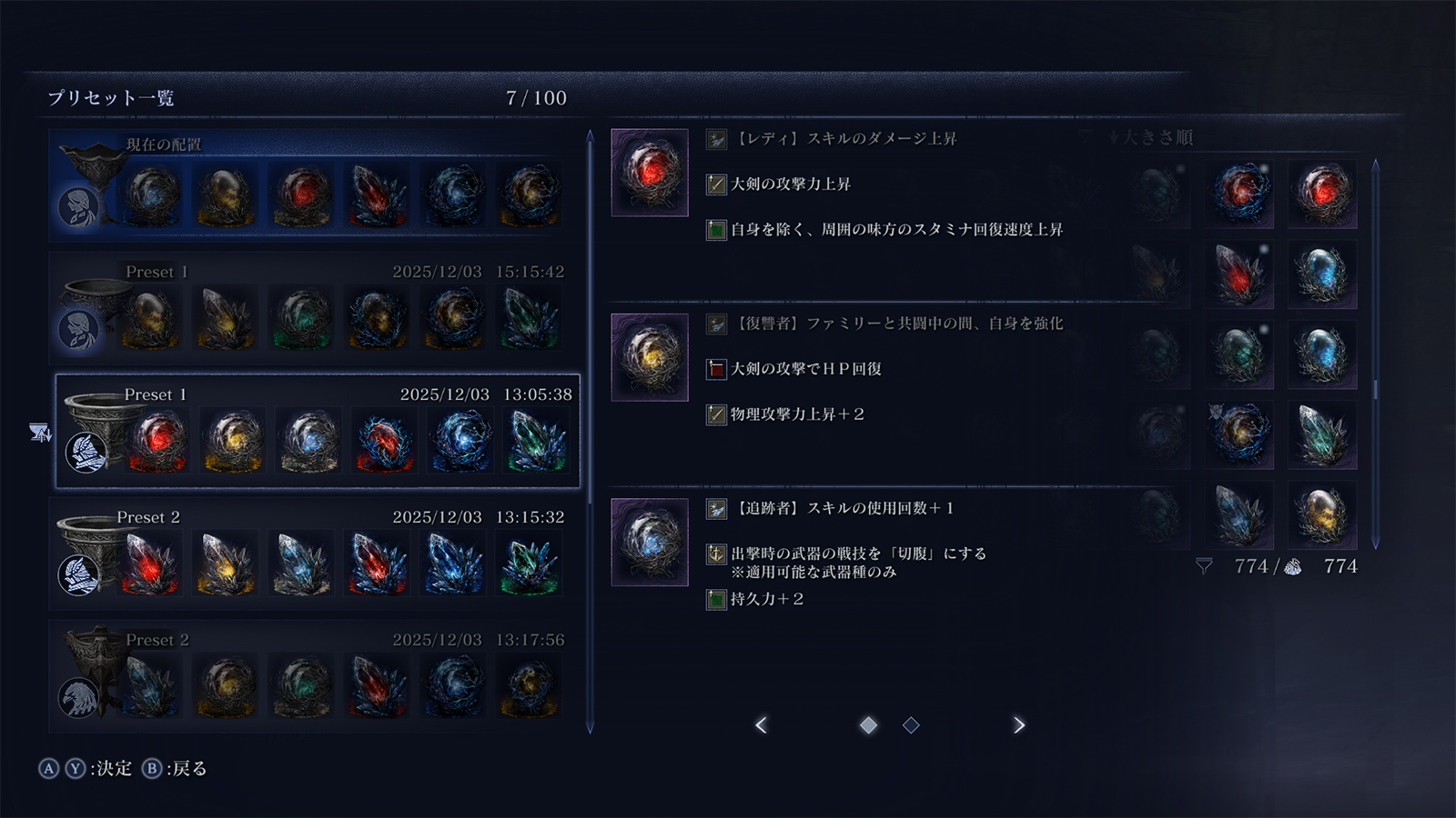 儀式 メニュー に おいて、 遺物 の プリ セット 一覧 の 並び 順 が キャラクター ごと に 並ぶ よう に 仕様 を 変更 選択
